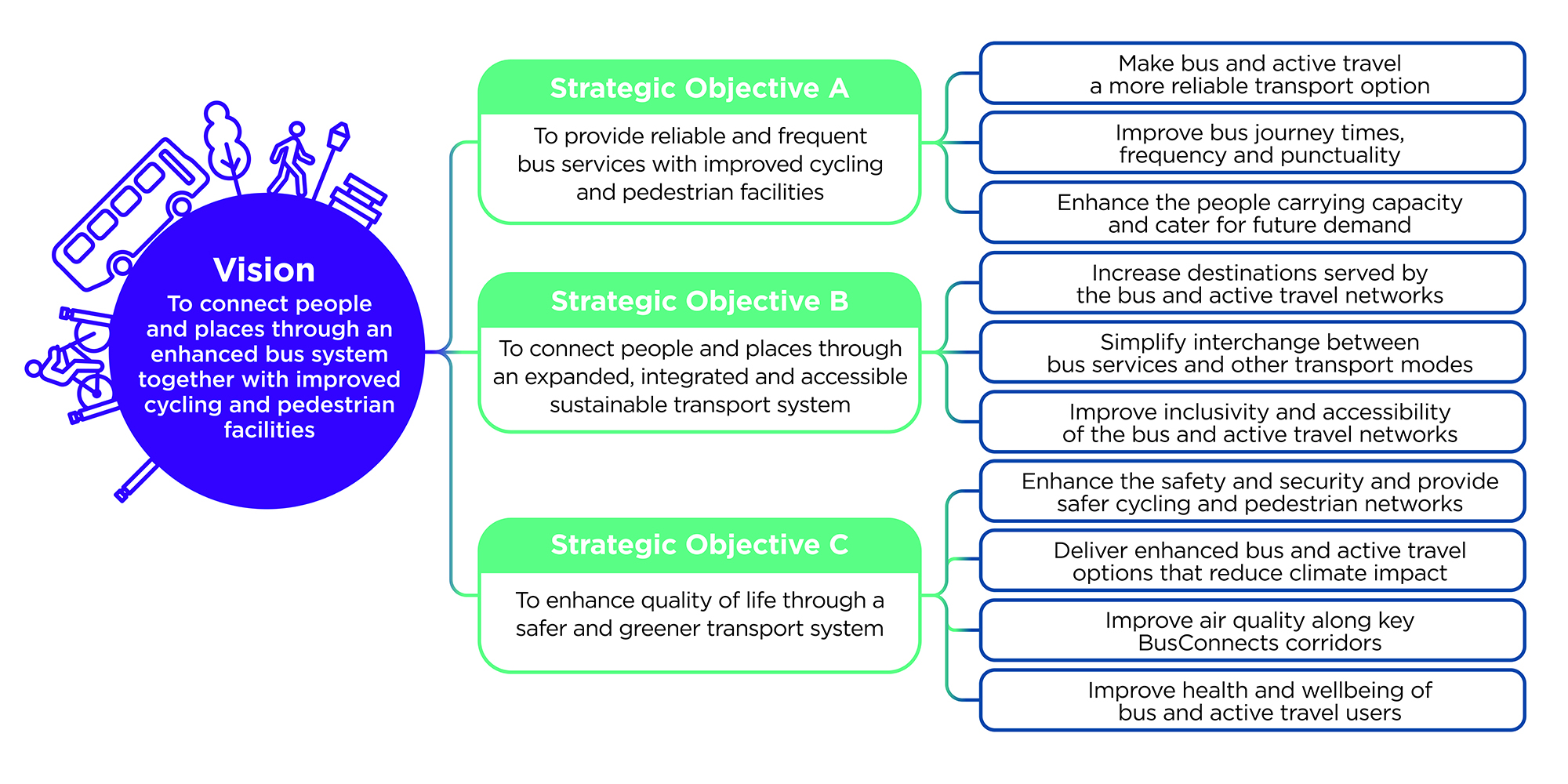 The scale and transformative potential of the BusConnects Programme reinforces its central role in influencing the future roadmap of Ireland’s transport system. It delivers on commitments within the National Development Plan 2021-2030, the Transport Strategy for the Greater Dublin Area 2022-2042, the Climate Action Plan 2023 and the National Planning Framework 2040.