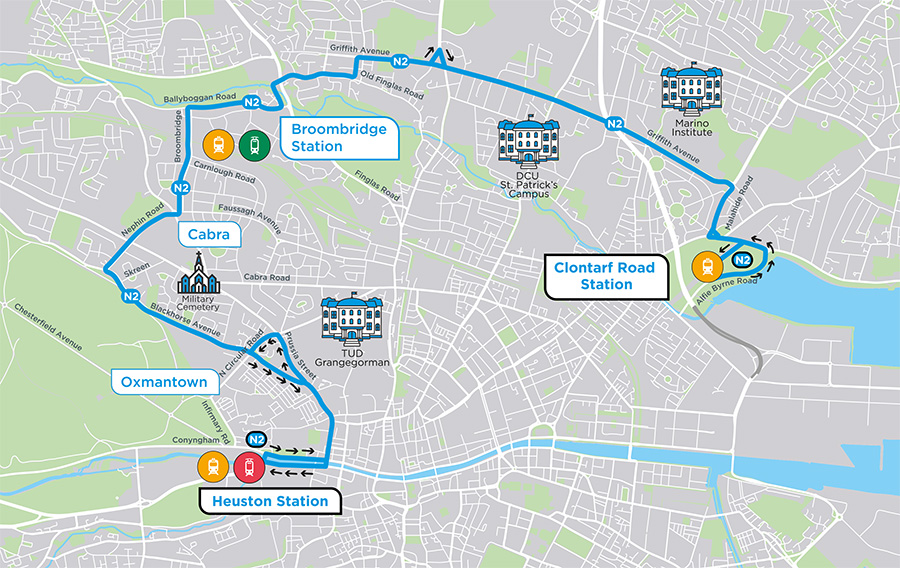 The N2 will run from Heuston Station in the west, to Clontarf Road Station on the east, serving key locations along Blackhorse Avenue, Nephin Road, Broombridge Luas, Ballyboggan Road, Old Finglas Road, Griffith Avenue and Marino. The service will run every 20 to 30 minutes with additional buses during peak hours to accommodate demand.